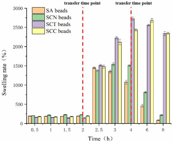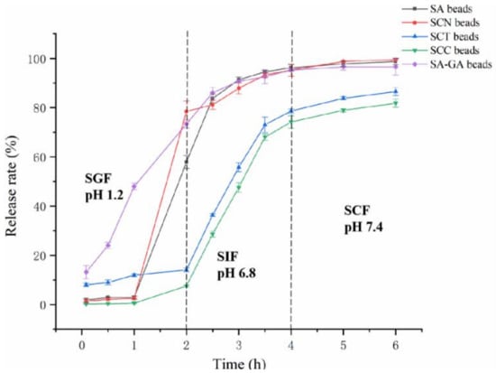 Generally, the swelling behavior of the wall material of the beads is regarded as a manifestation of the pH sensitivity of the beads [40]. Figure 7 shows the swelling rates of the beads prepared from different wall materials in different pH buffers. After being soaked at buffer (pH 1.2) for 0.5 h, the wall materials showed different degrees of swelling behavior. The maximum expansion rate is 203.80%, and the expansion rate of the remaining beads is also greater than 150%. After being immersed at buffer (pH 1.2) for 2 h, the swelling ratio of the beads did not increase significantly compared to 0.5 h. The swelling behaviors might because strong hydrogen bonds form between the -COOH and -OH groups of CCT and CN and the -OH groups of SA and other -OH groups in the solution when the samples were immersed in the acidic medium [15]. The swelling ratio of the beads greatly increased when transferred to buffer (pH 6.8). After 0.5 h, the swelling ratio of SCN beads was the lowest (1378.60 ± 19.08%), whereas the highest ratio was the SCT beads (1512.30 ± 26.94%). With the extension of time, the expansion rate of all beads showed an upward trend. After being soaked for 2.5 h, the swelling rate of SA beads reached its highest point; after being soaked for 3, 4, and 6 h, the SCN, SCT, and SCC beads reached their highest points, respectively.