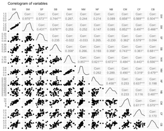 - Schoerke, B.; Cook, D.; Larmarange, J.; Briatte, F.; Marbach, M.; Thoen, E.; Elberg, A.; Crowley, J. GGally: Extension to ‘ggplot2’. R Package Version 2.1.2. 2020. Available online: https://CRAN.R-project.org/package=GGally (accessed on 6 January 2022).