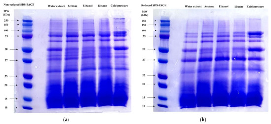 The molecular weight distributions of insect proteins are presented in Figure 1. Because it was difficult to separate parts from tiny insects, the various proteins in insects, such as muscle tissues, organs, and hemolymph, were extracted without separation in this study [29]. Similar patterns of protein bands were observed but with varying intensities (Figure 1). When compared to the control, the protein band at 50 kDa was fainter for the nonreducing organic solvent and cold pressure treatment (Figure 1a). The interfacial films of proteins can be affected by protein molecular weight, and the formation of high-molecular-weight protein polymers could help achieve good protein functionalities [23]. Disulfide bonds can occur via protein denaturation, which can be observed through a reducing method using mercaptoethanol [19]. Figure 1b shows that all treatments had a stronger intensity at 37 kDa, and fainter bands were observed above 100 kDa after reduction. Protein resistance to denaturation may differ depending on the protein source and can be affected by chemical reagents, temperature, pH, and processing method [30]. Protein denaturation during extraction induces changes in protein solubility owing to structural changes [23]. According to the data shown in Table 1, the amino acid composition differed according to the defatting method used, and these different compositions may be correlated with variations in the molecular weight distributions of the proteins. Overall, high-molecular-weight proteins with high resistance to denaturation could be extracted after removing fat using cold pressure, and this could help enhance protein functionalities.