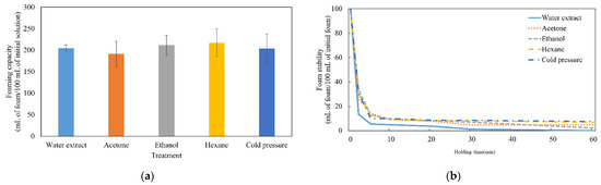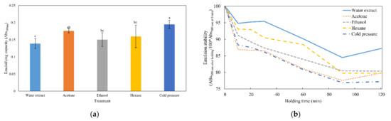 Furthermore, the electrophoresis results (Figure 1) showed there were no significant changes in the protein composition when different defatting methods were used. Damodaran [31] reported that low-molecular-weight proteins are more effective at forming emulsions. In addition, other studies have reported that low-molecular-weight emulsifiers show better emulsion capacity [32,33]. In this study, however, the abundance of low-molecular-weight proteins was high, and this dispersion may have affected the emulsifying properties of the solution. The emulsion stability results are shown in Figure 3b. At 120 min, protein samples that were defatted using acetone, ethanol, and hexane extraction and cold pressure treatment showed a lower emulsion stability than the protein samples subjected to water extraction. During the defatting process, the interaction between proteins is weakened, and the interfacial tension is decreased, reducing emulsion stability [34,35].