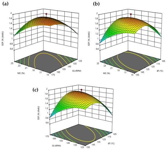 Response surface plots showing the effects of (a) moisture content (MC) and screw speed (SS), (b) moisture content (MC) and barrel temperature (BT), and (c) barrel temperature (BT) and screw speed (SS) on soluble dietary fiber content (SDF).