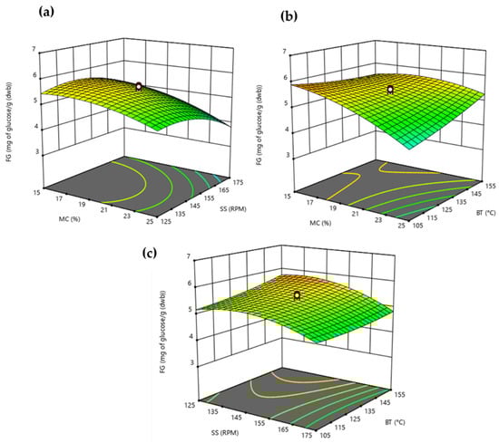 Response surface plots showing the effects of (a) moisture content (MC) and screw speed (SS), (b) moisture content (MC) and barrel temperature (BT), and (c) barrel temperature (BT) and screw speed (SS) on free glucose content (FG).
