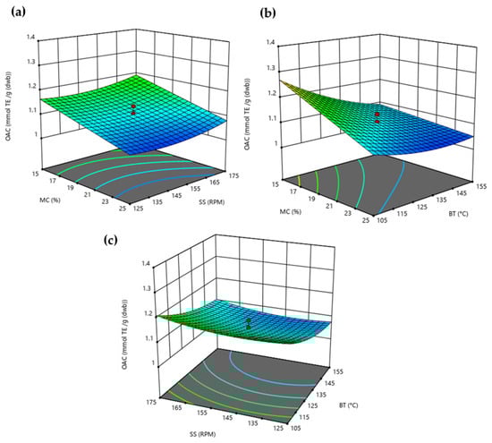 Response surface plots showing the effects of (a) moisture content (MC) and screw speed (SS), (b) moisture content (MC) and barrel temperature (BT), and (c) barrel temperature (BT) and screw speed (SS) on overall antioxidant content (OAC).
