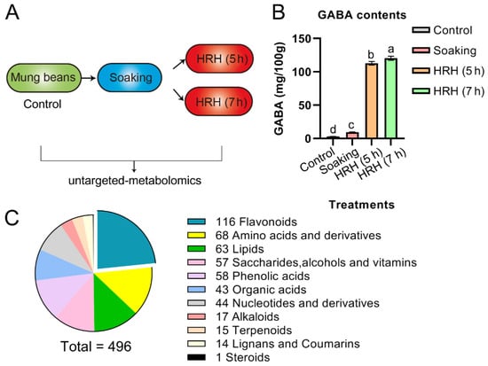 (A) Schematics depicting how to prepare the samples in this study. (B) GABA content during processing, a,b,c,d, p < 0.05. (C) Eleven types of metabolites were identified in mung beans during GABA-enrichment processing.