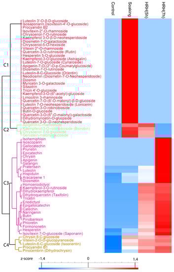 Mung bean is well known for its high level of flavonoids. Flavonoids are the most important secondary metabolites and contribute to the antioxidative activities of mung beans [,] They are also related to the hypoglycemic, hypolipidemic, anti-cancer, immunomodulatory activity, and anti-melanogenesis properties of mung beans []. The total relative content of flavonoids increased after the GABA enrichment processing. The highest level of flavonoids was observed after soaking and slightly decreased after HRH treatment. Thus, soaking was a critical step for the enrichment of total flavonoids. However, the changes of individual flavonoids were different. In detail, the glycosylated flavonoids were enriched during soaking and decreased to a similar level to the control group after HRH treatment (Figure 2, Cluster 1). While, un-glycosylated flavonoids were significantly upregulated after HRH treatment (Figure 2, Cluster 3). In contrast to mung beans, the glycosylation was decreased in soyabeans during soaking because of the increased β-glucosidase activity []. Thus, the general knowledge of soyabeans on flavonoids’ glycosylation cannot be generalized to mung beans. The reason and effect of diverse changes of individual flavonoids in mung beans during processing need to be further investigated.