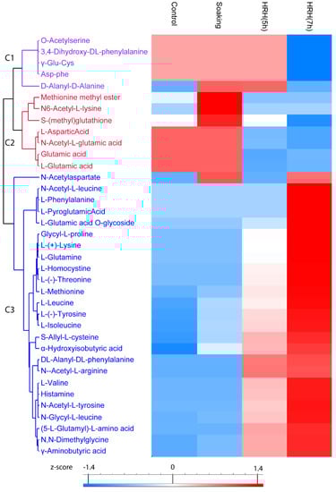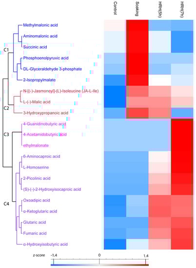 In total, 21 organic acids significantly changed (1.5 times fold, p < 0.05) during processing, which can be divided into four clusters. In Cluster 1, the relative concentration of these compounds was the highest after soaking and decreased during HRH treatment. For example, the relative concentration of methylmalonic acid, aminomalonic acid, and succinic acid was significantly lower than that of the control group after a long time HRH treatment (Figure 5, Cluster 1). In Cluster 2, the relative amount of these organic acids (N-[(-)-Jasmonoyl]-(L)-Isoleucine (JA-L-Ile), L-(-)-Malic acid, and 3-Hydroxypropanoic acid) was higher after soaking and slightly decreased during HRH treatment, but still higher than that of the control group, except for 3-hydroxypropnoic acid (Figure 5, Cluster 2). In Cluster 3, the relative concentration of three organic acids (4-guanidinobutyric acid, 4-acetamidobutyric acid, and ethylmalonate) only significantly increased after a long time of HRH treatment (Figure 5, Cluster 3). In Cluster 4, the relative concentration of these organic acids was higher after HRH treatment. Of note, the relative content of oxoadipic acid and α-ketoglutaric acid was higher in HRH (5 h) than in HRH (7 h). However, for the other seven organic acids in this cluster, the relative concentration of them was higher after HRH (7 h) treatment (Figure 5, C4). In addition, the relative concentration of fumaric acids was more than 15 and 18 times higher after HRH (5 h) and HRH (7 h) treatment than that of the control group, respectively. Moreover, the abundance of α-ketoglutaric acid increased more than 22 and 21 times after HRH (5 h) and HRH (7 h), respectively.