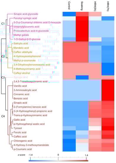 In total, the relative content of 33 phenolic acids significantly changed (1.5 times fold change, p < 0.05) during processing, which can be divided into four clusters. The relative concentration of sinapic acid-glycoside, feruloyl syringic acid, 5-O-p-Coumaroyl shikimic acid O-hexoside, sinapoylglucuronic acid, protocatechuic acid-4-glucoside, methyl gallate, and 1-O-Galloyl-β-D-glucose in Cluster 1 significantly increased after soaking and decreased after HRH treatment (Figure 4, Cluster 1). Moreover, the relative concentration of eight phenolic acids, including salicylic acid, mandelic acid, etc., in Cluster 2 was higher in the control and soaked group but lower in the HRH-treated group, especially for a long time (Figure 4, Cluster 2). The relative content of syringic acid decreased only after soaking (Figure 4, Cluster 3). Moreover, the most frequently reported phenolic acids in mung beans, including ferulic acid, caffeic acid, gallic acid, and coumaric acid, accumulated during HRH treatment and reached the highest level after 7 h. (Figure 3, C4).