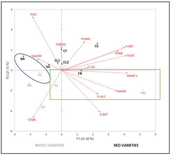 In terms of the number of compounds, white varieties showed a higher number of acids, PAH’s, C13-norisoprenoids and terpenes, while red varieties showed a higher number of alcohols, C6 compounds, aldehydes, esters and lactones in both free and bound fractions.