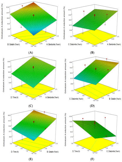 With an increment in bentonite (X1) and gelatin (X2) levels from 0.25% to 0.75%, the loss of OTA was significantly increased (Figure 1A–E). Our findings are similar to those of previous studies that showed that increasing the concentration of bentonite in different types of wine led to a decrease in OTA [,,]. However, Sun et al. (2017) observed that there were no significant differences among the OTA removal of wine samples clarified by various concentrations of bentonite (0.12, 0.16, and 0.20 mg/mL), and they could result in a 10% loss of OTA [].