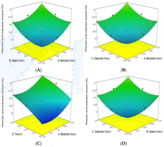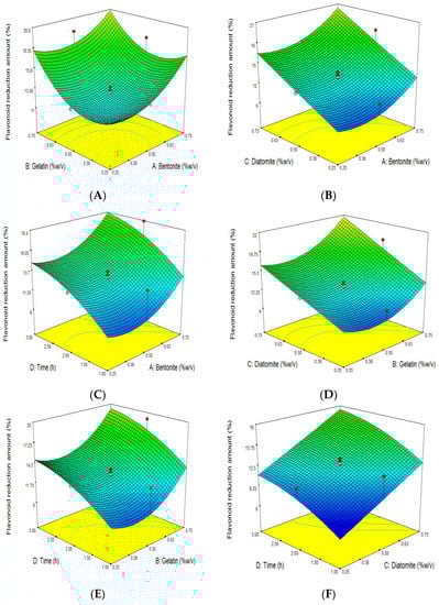 The interaction effects of gelatin on the reduction of TFC with bentonite, diatomite, and time were investigated and are shown in Figure 3A,D,E. Among the second-order coefficients, gelatin has the highest value. Therefore, it showed the most substantial impact on the reduction of TFC (Table 4). Ren et al. (2020) found that the clarifying of berry wine with gelatin resulted in a reduction in TFC (approximately 16.5%) []. Anthocyanins and gelatin are positively charged; therefore, they could not absorb each other []. However, tannins containing a negative charge could play the role of mediator between both mentioned components and settle them.
