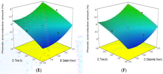 Response surface plot of the effects of bentonite, gelatin, and diatomite concentration and clarifying time on grape juice’s phenolic acid reduction amount (%). Influence of (A): gelatin and bentonite, (B): diatomite and bentonite, (C): time and bentonite, (D): diatomite and gelatin, (E): time and gelatin, (F): time and diatomite, on grape juice’s phenolic acid reduction amount (%).