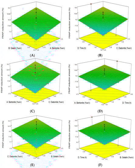 Due to the antioxidative properties of grapes and their ability to reduce or prevent oxidative stress [], the assessment of clarifying grape juice antioxidant capacity has high importance. In this study, the antioxidant capacity reduction (assessed by the FRAP method) of grape juice samples ranged between 16.43% (Run 1) and 19.89% (Run 17) (Table 1). For generating a relationship between the antioxidant capacity reduction and clarifier concentration, and clarification time (Table 3), a linear polynomial equation is given as follows: