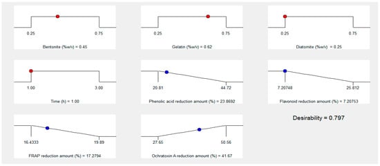 In order to produce safe grape juice, multi-objective optimization was employed to achieve maximum OTA diminution and a minimal decrement in compounds and antioxidant capacity. After analyzing the data of thirty experiments and obtaining valid prediction models for each response, the software selected a solution. As shown in Figure 5, the optimal experimental conditions predicted by the face-centered central composite design were: bentonite of 0.45% w/v, gelatin of 0.62% w/v, diatomite of 0.25 w/v, and clarification time of 1 h. The reductions in OTA, TPC, TFC, and antioxidant activity were calculated as 41.67%, 23.86%, 7.20%, and 17.27%, respectively.