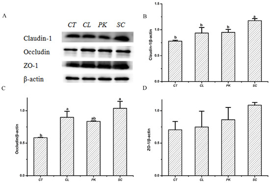 Effects of the yeast strains on the tight junction proteins expression of HT–29 cell monolayers. (A) Western blotting images of Claudin–1, Occludin and ZO–1. (B) Relative expression of (B) Claudin–1, (C) Occludin, (D) ZO–1. Different lowercase letters marked on the column represent significant difference (p < 0.05).