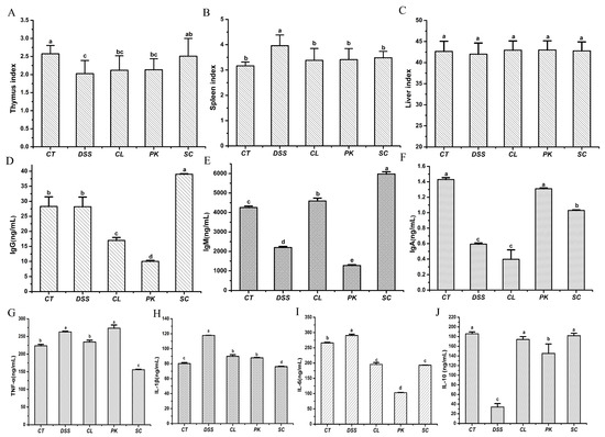 Organ index, contents of immunoglobulin and inflammatory factors in serum of Balb/c mice. (A–C) Thymus index, Spleen index, Liver index; (D–F) IgG, IgM, IgA; (G–J) TNF–α, IL–1β, IL–6, IL–10. Different lowercase letters marked on the column represent significant difference (p < 0.05).