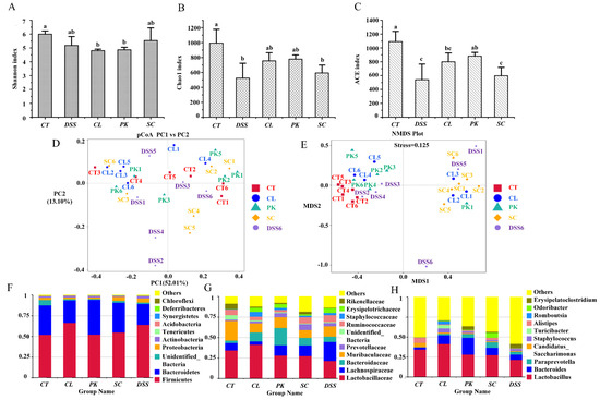 Intestinal microflora diversity and gut microbiota composition of Balb/c mice in different groups. (A–E) Shannon index, Chao 1 index, ACE index, PCoA, NMDS of each group; bar picture of the gut microbiota at the (F) Phylum level, (G) Family level, (H) Genus level. Different lowercase letters marked on the column represent significant difference (p < 0.05).