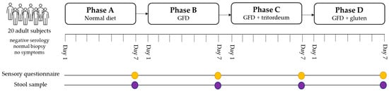 The study comprised four phases, all lasting seven days (Figure 1). Briefly: (i) phase A: regular gluten diet. The patients incorporated the gluten-containing bread that they usually consume into their diet. No gluten restrictions were imposed to guarantee a minimum gluten intake of 100 g/day. (ii) Phase B: strict GFD. During this phase, patients consumed the gluten-free bread that their celiac relatives typically purchase. (iii) Phase C: continuation of the strict GFD. In this phase, a range of 100–150 g of Tritordeum bread was incorporated throughout their daily intake. (iv) Phase D: GFD for the last seven days of the study, in which a gluten-containing bread was also incorporated in the same format as Tritordeum bread (provided by the same company). Consumption was also a minimum of 100 and a maximum of 150 g/day, distributed over meals. The patients were blind to which type of bread was consumed during phases C and D. At the end of each phase, a stool sample (samples A, B, C, and D, respectively) and a clinical questionnaire testing the palatability and preference of bread were collected.