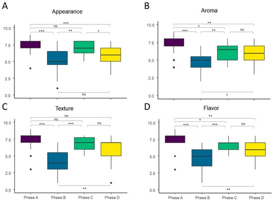 (A) Appearance, (B) aroma, (C) texture, and (D) flavor of dietary phases in the study. Phase A: normal diet and bread of choice with gluten, phase B: gluten-free diet and gluten-free bread, phase C: gluten-free diet and tritordeum bread, phase D: gluten-free diet and wheat bread. Statistical significances were obtained by Mann–Whitney–Wilcoxon test. * p < 0.05; ** p < 0.01; *** p < 0.001; ns, not significant.