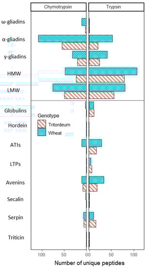 As shown in Figure 3, both enzymatic treatments were effective in recognizing peptides from gluten proteins and NGPs. However, the number of peptides identified in each type of protein varied between both treatments, being this number higher for gliadin proteins when chymotrypsin was used, and for glutenin proteins and NGPs when trypsin was used (Figure 3). In the case of gluten proteins, there were more unique peptides assigned to these proteins in white wheat flour than in Tritordeum flour (Figure 3), regardless of the digestion enzyme used. This difference was more noticeable for α-gliadins. The same occurred in the case of amylase/trypsin-inhibitors (ATIs) and avenins; however, Tritordeum had more unique peptides assigned for the other NGPs such as globulins, plant lipid transfer proteins (LTPs), and serpins (Figure 3).