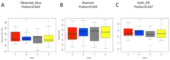 Results of the Alpha diversity analysis. (A) Observed Otus, (B) Shannon, and (C) Faith PD alpha diversity indexes for each phase of the study at a depth of 7393 sequences per sample. The p-value for each alpha diversity index was estimated using a Kruskal–Wallis test.