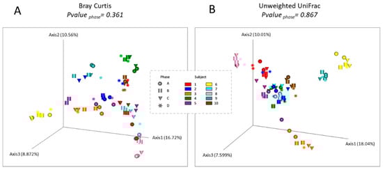 Principal coordinate analysis (PCoA) of the (A) Bray Curtis and (B) Unweighted UniFrac beta diversity distances of the four phases of the study. The p-value was estimated using a Permanova test. Each phase is represented by different shapes and each subject in a different color.