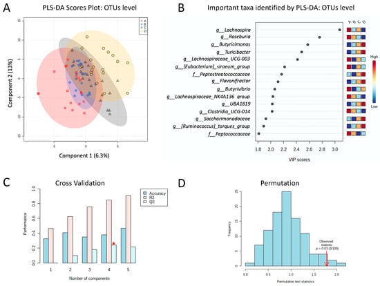 (A) Partial least square-discriminant analysis (PLS-DA) two-dimensional (2D) scores plot of the bacterial taxa of each phase of study at OTUS level. The model was established using two principal components; explained variance is in parentheses. (B) Loading importance of bacterial taxa in the first PLS-DA component at OTUS level. Colored boxes indicate relative concentrations of the corresponding bacterial taxa in each diet. (C) Cross Validation: PLS-DA classification using different number of components based on the accuracy (blue), R2 (pink), Q2 (light blue) by 10-fold CV method. The red star indicates the best classifier. (D) Permutation: PLS-DA model validation by permutation tests based on separation distance. The p value based on permutation is p = 0.03 (3/100). VIP: Variable Importance in Projection.