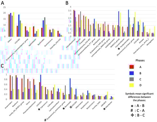 Bar plots of the relative abundance of each taxonomic group in percentage within each phase at genera level. (A) Taxa with a relative abundance ≥ 5% in at least one phase; (B) Taxa with a relative abundance ≥ 1% and <4% in at least one phase; (C) Taxa with a relative abundance < 1%. Others corresponds to the total sum of unassigned taxa. Symbols indicate significantly different taxa (p-value ≤ 0.05) by non-parametric Kruskal–Wallis test.