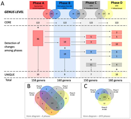 Finally, when analyzing only gluten-free diets (i.e., phases B, C, and D; Figure 8C) the bacterial core microbiome is composed by 128 genera, including six more genera than when considering the four phases. These genera are Atopobium, Catabacter, Citrobacter, Coprobacter, Epulopiscium, and Fenollaria.