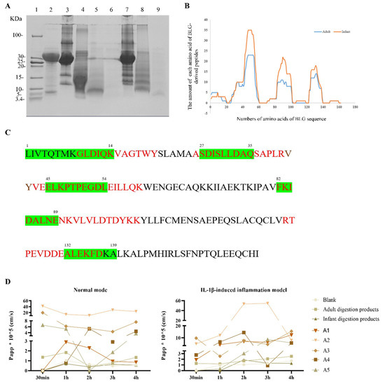 Gastric digestion of cow’s milk and the good transport ability of BLG digestion-derived peptides by the Caco-2 cell monolayer. The protein profile of cow’s milk after simulated digestion was detected by (A) Tricine-SDS-PAGE. Lane 1: unstained low range protein ladder. Lane 2: pepsin. Lane 3: the cow’s milk. Lane 4: cow’s milk digested in the simulated adult gastrointestinal fluid for 0 min. Lane 5: cow’s milk digested in the simulated adult gastric fluid for 60 min. Lane 6: cow’s milk digested in the simulated adult gastrointestinal fluid for 60 min. Lane 7: cow’s milk digested in the simulated infant gastrointestinal fluid for 0 min. Lane 8: cow’s milk digested in the simulated infant gastric fluid for 60 min. Lane 9: cow’s milk digested in the infant simulated gastrointestinal fluid for 60 min. (B) The line graph shows the distribution of BLG-derived peptide segments after simulated adult and infant digestion. Y-axis value represents the occurrence numbers of amino acids of BLG peptides. (C) The whole amino acid sequence of BLG used in our study; the red letters indicate the areas where unique peptides are present after the simulated digestion of the infants, while the green letters represent unique peptides in the adults’ digestion. (D) The Papp of BLG peptides across Caco-;2 monolayers at 30 min, 1 h, 2 h, 3 h, and 4 h in the normal model and IL-1β-induced inflammation model, respectively. The data were calculated in three replicates. BLG, beta-lactoglobulin. Papp, apparent permeability coefficients.