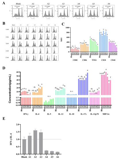 Furthermore, the co-culture assay of peptide–LP cell–MLN-CD4+ T cells is shown in Figure 4. The ability to promote DC maturation after stimulation with A1, A2, and A4 was similar by the expression of CD80 and CD86, while A3 increased the expression of CD80 and CD86. Interestingly, in the co-culture assays of peptide–LP cells and peptide–LP cell–MLN-CD4+ T cells, A3 increased CD80/CD86 expression, indicating that the peptide A3 stimulated the pathway selectivity of DC cells. MIP-3α is responsible for inducing the migration of immature dendritic cells, effector, or memory T cells, and B cells [25]. From Figure 5D, the significant increased secreted cytokine of MIP-3α was detected after A3 treatment; this was another cue for the promotion role of A3 for biological functions of DC, while the A4 and A5 treatment showed the opposite role compared with the A3 group.