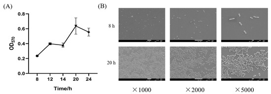 Biofilm formation curve of L. plantarum Y42 (A); SEM images of the L. plantarum Y42 biofilms on glass at 8 and 20 h (B).