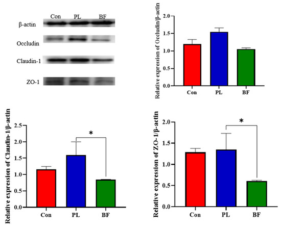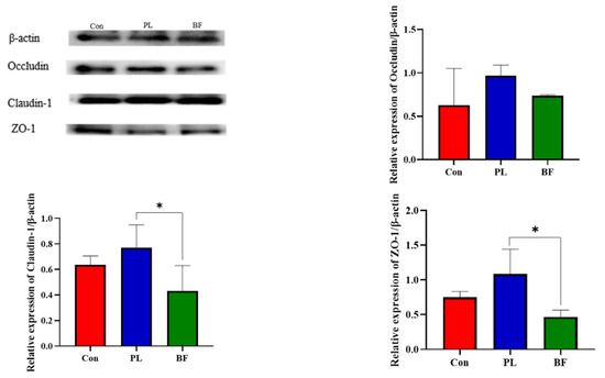 Effect of L. plantarum Y42 in the planktonic and biofilm states administration on the TJ proteins expression in mice; *: p < 0.05. All data are presented as mean ± SD. Note: Con means control group; PL means planktonic group; BF means biofilm group.