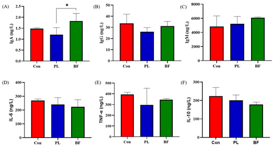 Probiotics could increase the serum immunoglobulin contents of the host [31]. In order to evaluate the effects of L. plantarum Y42 in the biofilm and planktonic states on the immunology in the serum of mice, the contents of IgA, IgG, and IgM were measured. As shown in Figure 5A–C, the concentration of IgA in BF group was significantly higher than PL group (p < 0.05). Additionally, the IgG and IgM concentrations in the three groups showed no significant differences (p > 0.05). These results indicated that the concentrations of immunoglobulin in both groups remained relatively normal, and the addition of probiotics moderated and prevented an excessive increase in immunoglobulin.