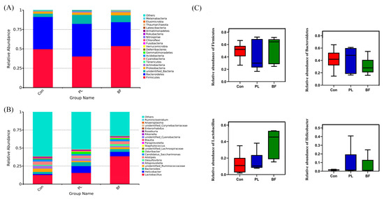 Relative abundance of bacterial communities of the fecal samples at the level of phylum (A), genus (B), and the relative abundance of Firmicutes, Bacteroidetes, Lactobacillus, and Helicobacter (C) of bacterial communities. All data are presented as mean ± SD. Note: Con means control group; PL means planktonic group; BF means biofilm group.