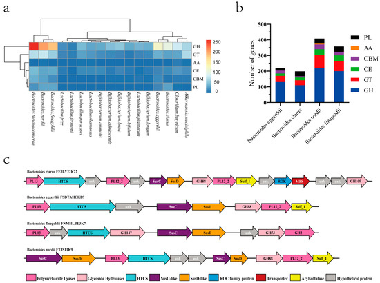 Genome-wide carbohydrase analysis of the gut microbiota. (a) Cluster heatmap of CAZymes of common intestinal microorganisms. (b) Specific statistics of the CAZymes of B. eggerthii, B. clarus, B. nordii, and B. finegoldii. (c) PULs of B. eggerthii, B. clarus, B. nordii, and B. finegoldii.