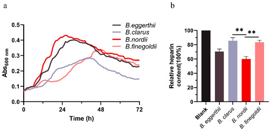 Based on the results of the above genomic and CAZymes data analyses, it was determined that the four Bacteroides strains may utilize heparin. The strains were cultured in a medium with heparin as the only carbon source and fermented for 72 h. Growth curves were measured and significant changes in heparin content were observed. As shown in Figure 2a, the growth curves of the four strains of Bacteroides based on heparin were generated, and the OD600 values were measured at 1 h intervals. The four strains could grow on a medium consisting of heparin as the sole carbon source. Among these, B. nordii displayed the best growth conditions. As shown in Figure 2b, B. nordii could best utilize heparin, and the remaining three strains were slightly less capable of utilizing heparin. Significant differences in heparin consumption by B. nordii were observed relative to heparin consumption by B. clarus and B. finegoldii. The results of the polysaccharide consumption measurements were consistent with those of the growth curve. Therefore, all four strains of Bacteroides obtained using genomic and CAZymes analyses could effectively utilize heparin.