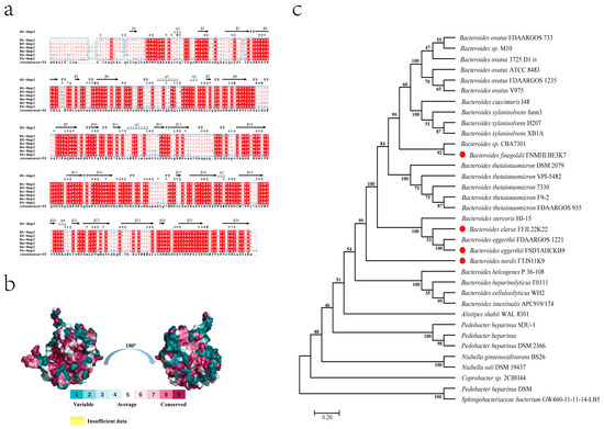Heparinase belongs to the PL13 family of polysaccharide lytic enzymes. The known strains of bacteria hosting the PL13 family of genes were screened with the four strains of Bacteroides to construct an evolutionary tree. These four Bacteroides were found to be distant from the remaining three strains in terms of their affinity for B. nordii (Figure 3a). The amino acid sequences of the four heparinases were analyzed by multiple sequence alignment for structural conservativeness. The heparinases of B. nordii were found to slightly differ in the amino acid residues on the protein surface, However, the active pocket regions of the four heparinases remained almost identical. These findings suggest that Bn-HepI may have a large variation in thermal stability (Figure 3b).