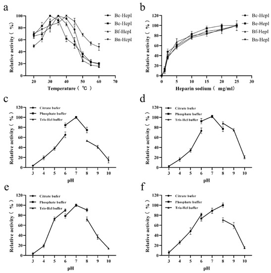 Effects of temperature (a), concentrations of heparin (b), and pH (c–f) on the activities of Bc-HepI (c), Be-HepI (d), Bf-HepI (e), and Bn-HepI (f).