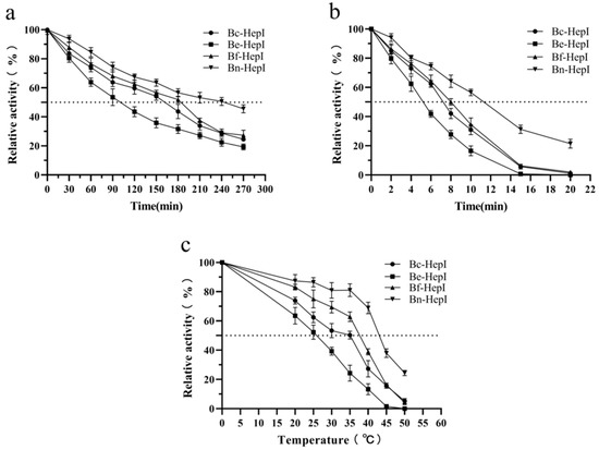 To verify the thermal stability of the enzymes, the half-lives of each enzyme at 40 °C (Optimum temperature) and 50 °C (Deactivation temperature) were determined. Compared with Be-HepI, the half-lives of Bc-HepI, Bf-HepI, and Bn-HepI at 40 °C were, respectively, 71.29%, 82.18%, and 141.58% higher than that of Be-HepI. The half-life of Be-HepI was 101 min (Figure 5a). The half-lives of Bc-HepI, Bf-HepI, and Bn-HepI at 50 °C were 32.65%, 61.22%, and 116.33% higher than that of Be-HepI, respectively (Figure 5b).