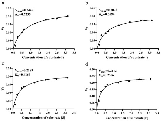 The kinetic parameters of Bc-HepI, Bf-HepI, Be-HepI, and Bn-HepI were determined at optimum temperature and pH. The Km and Vmax values were calculated after fitting.