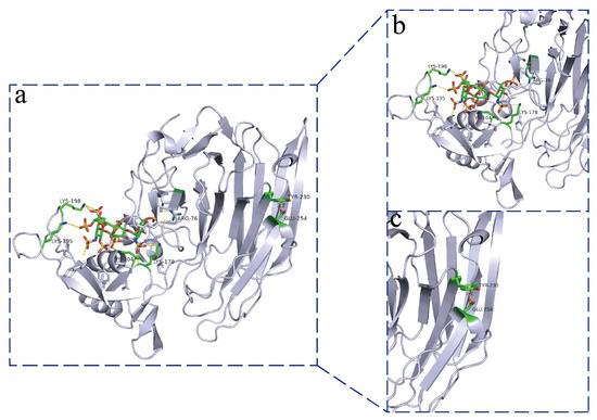 There are few reports on the structure of heparinases. At present, only the structure of HepI, including the active region of the enzyme and the binding region of Ca2+ ions in Bacteroides have been analyzed [23]. However, the thermal stability of HepI has not been evaluated. In this study, the thermal stability of heparinase was further assessed by simulating the protein structure and docking with the substrate (Figure S4). π-stacking is a weak interaction caused by the conjugation of the π-electron system in a special spatial configuration. At present, the widely accepted forms of π-stacking are π–π, cation–π, anion–π, halogen bond–π, and CH–π stacking. π-stacking is widely found in biological macromolecular systems and often plays a key role in the maintenance of specific structures of proteins and protein thermal stability [55,56]. Structural analysis of Bn-HepI revealed a cation–π conjugation between the amino acid residues, Tyr230 and Glu254. The other three proteins did not interact with each other.