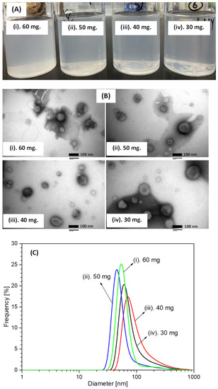 Photographs of liposome dispersions prepared at a temperature of 50 °C and pressure of 10 MPa (A), with their TEM images (B) and size distributions (C).