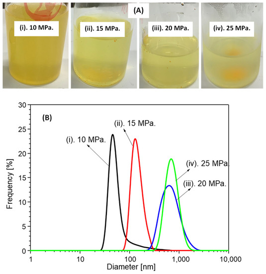 Aqueous suspensions (A) and their size distributions (B). Suspensions were prepared at 50 °C and various operating pressures.