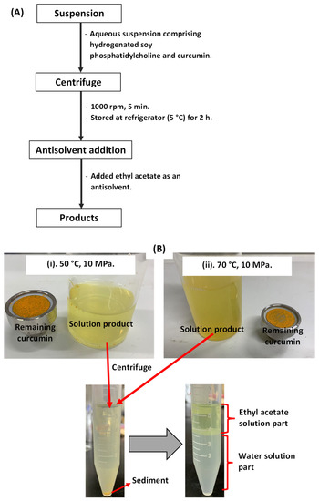 Curcumin separation process: (A) separation procedure and (B) photographs.