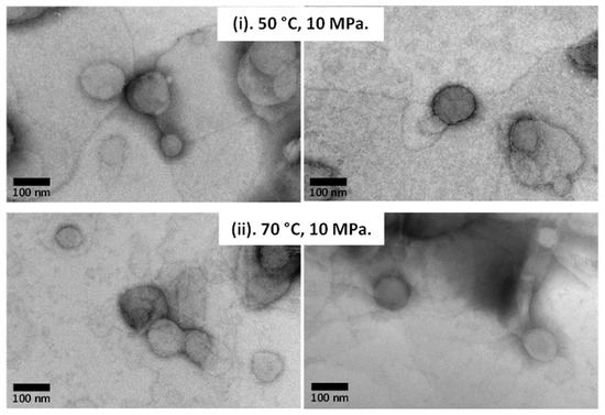 One of the important steps in liposome generation processes involving the encapsulation of compounds with liposomes is to observe their characteristic features. This was used to confirm the desired liposomal products. The physical parameters of the liposome products (particle size and zeta potential) are summarized in Table 1. As a critical liposome parameter, liposome size may affect biodistribution and activity [33,35]. It can also affect drug release as well as transdermal and dermal drug delivery. The liposome size was analyzed by introducing the collected aqueous solution products into a DLS device, which is the most common device for analyzing nanomaterial size in suspensions, including liposomes generated from hydrogenated soy phosphatidylcholine. As shown in Table 1, the size of the liposome products increased with increasing operating pressure at each operating temperature. As previously mentioned, the increased operating pressure resulted in increased sizes of the liposome products, owing to coalescence or aggregation during depressurization. Although DLS is a rapid technique that can be used to measure particle sizes from 2 mm to <1 nm and requires a small amount of sample, this analysis technique has poor sensitivity to aggregation. The presence of aggregates in a sample solution, even in small amounts, may cause the particle diameter to increase. As a result, as listed in Table 1, liposome products with diameters larger than 500 nm were found under each operating condition. Conversely, liposome products with large diameters owing to liposome coalescence or aggregation were not observed in the TEM images (Figure 1B and Figure 4). The TEM images showed that the diameters of the liposome products were around 100 nm or below 100 nm. This distinction might be due to differences in the sample preparation and limitations of the nanoparticle sizing technique. The TEM device may act as a tool to capture the individual particle size, and can be employed to measure the particle size once the samples have been suspended and dried. Thus, larger sizes of the liposome products measured due to agglomeration can be minimized. Since DLS was conducted in solution form, the agglomeration and density of particles may have interfered with the reliability of the measurements during analysis. Therefore, the diameter of the liposome products determined by TEM was much smaller than that determined by DLS [38,39,40].