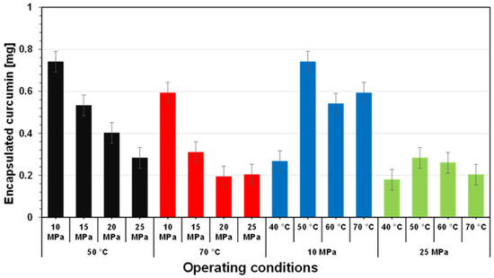 In addition to the operating pressure, changing the operating temperature also impacted the amount of liposome-encapsulated curcumin following preparation by the SCCO2 technique. Figure 5 also shows the amount of liposome-encapsulated curcumin in the aqueous products when encapsulation was performed at various operating temperatures with operating pressures of 10 MPa (blue) and 25 MPa (green). As depicted in Figure 5 (blue), the amount of liposome-encapsulated curcumin was initially 0.27 mg when the experiment was performed at an operating temperature of 40 °C and an operating pressure of 10 MPa. At the same operating pressure, the curcumin amount increased to 0.74 mg at an operating temperature of 50 °C, and then decreased to 0.59 mg at 70 °C. The same phenomenon was found when curcumin encapsulation using liposomes was conducted at a constant operating pressure with various operating temperatures. At 40 °C, the amount of liposome-encapsulated curcumin was 0.18 mg. When the operating temperature was increased to 50 °C, the amount of liposome-encapsulated curcumin reached 0.28 mg. It then decreased to 0.20 mg at an operating temperature of 70 °C with the same operating pressure. Zhao et al. performed lutein encapsulation in liposomes under pressurized carbon dioxide and observed that the operating temperature had a significant effect on the physical features of aqueous suspensions [31]. Operating temperature affected bilayer membrane features such as permeability, fluidity, and degree of order. They explained that high operating temperatures (>50 °C) may help to break the interactions between the phospholipid alkyl chains, i.e., mainly van der Waals forces and hydrophobic interactions. Hence, increasing the operating temperature may favor the encapsulation of lutein because it may enhance the permeability, fluidity, and disorder of the bilayers. In contrast, in addition to the high operating temperature in the pressurized carbon dioxide system, which weakened the dispersion of phospholipid bilayers and encapsulated compounds, Shishir et al. reported that high environmental temperatures in an aqueous medium may cause a high energy input that can interfere with the partial interactions between phospholipids and encapsulated compounds, including lutein compounds [37]. Consequently, as shown in Figure 6 (blue and green), the amount of liposome-encapsulated curcumin decreased as the operating temperature increased at a given operating pressure.
