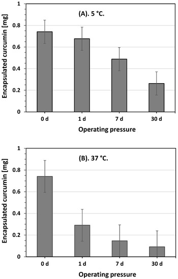 Amount of encapsulated curcumin after storage at temperatures of (A) 5 °C and (B) 37 °C.