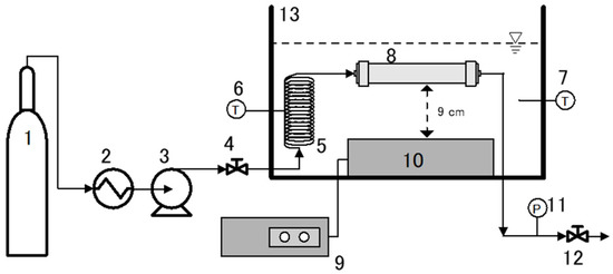 Scheme of the experimental apparatus: 1. CO2 cylinder; 2. chiller; 3. high-pressure pump; 4. needle valve; 5. SUS–316 pre-heater; 6, 7. temperature monitor; 8. SUS vessel; 9. ultrasonic controller; 10. ultrasonic vibrator; 11. pressure monitor; 12. BPR; 13. chamber.