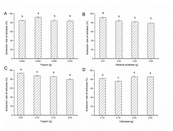 The effects of adding different proteases on the extraction of cellulose. (A) The effect of papain addition on the extraction of cellulose. (B) The effect of alkaline protease addition on the extraction of cellulose. (C) The effect of trypsin addition on the extraction of cellulose. (D) The effect of cellulase addition on the extraction of cellulose.
