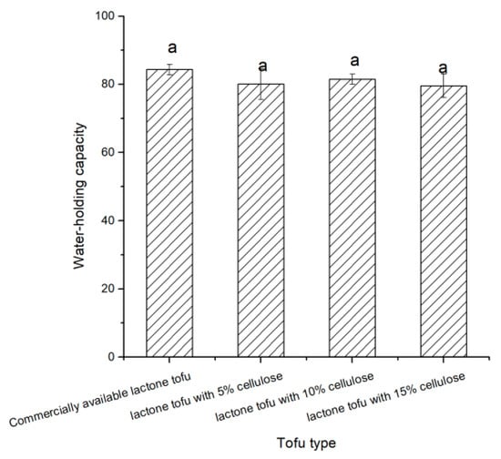 Examples of lactone tofu with 5% cellulose, 10% cellulose, and 15% cellulose were produced to compare with the commercially available lactone tofu. Water is an important component of tofu, and it has a very important influence on its quality stability and structural composition [,,]. Water can be coupled to functional groups of polysaccharides and proteins in gel systems, or it can be trapped in microscopic meshes and holes in the gel network []. According to Li et al. (2014), tofu’s water-holding capacity is mostly determined by its composition and microstructure []. It can be seen in Figure 2 that there were no significant differences in water-holding capacity between the tofu made from the three different processes and the commercially available lactone tofu (p > 0.05), showing that the innovative process of making tofu yielded good water-holding capacity.